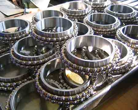 双列角接触球轴承能承受较大的径向负荷为主的径向和轴向联合负荷和力矩负荷,限制轴的两方面的轴向位移。主要用于限制轴和外壳双向轴向位移的部件中双列角接触球轴承内、外圈之间的可倾斜性有限,允许倾斜角取决于轴承的内部间隙、轴承尺寸、内部设计及作用于轴承上的力和力矩,而Z大允许倾斜角应保证轴承内不会产生过高的附加应力。若轴承内、外圈之间存在倾斜角,将影响轴承的寿命,同时造成轴承运转精度下降,运转噪声增大。双列角接触球轴承一般采用尼龙保持架或黄铜实体保持架。双列角接触球轴承安装时应注意,虽然轴承可承受双向轴向载荷,但若一侧有装球缺口时,则应注意不要让主要轴向载荷通过有缺口的一侧沟边。在轴承使用时应注意使不带装球缺口的一侧滚道承受主要载荷。
