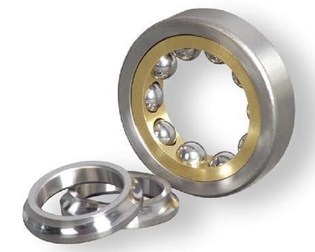 单列角接触球轴承只能承受一个方向的轴向负荷,在承受径向负荷时,将引起附加轴向力。 并且只能限制轴或外壳在一个方向的轴向位移。角接触球轴承的接触角为40度,因此可以承受很大的轴向负荷。角接触球轴承是非分离型的设计,内外圈的两侧的肩部高低不一。为了提高轴承的负载能力,会把其中一侧的肩部加工得较低,从而让轴承可装进更多的钢球。